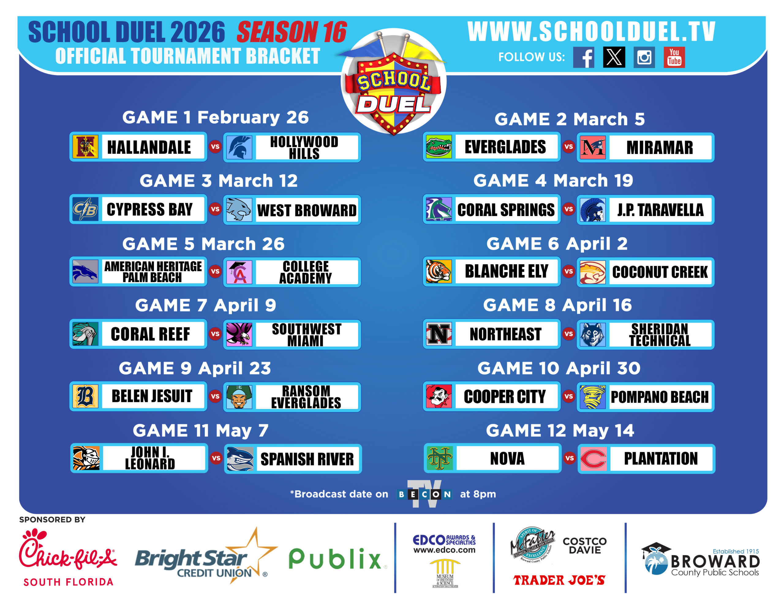School Duel airs on BECON-TV every Thursday at 8 p.m. A new episode will air every following Thursday evening. In addition, every week’s episode rebroadcasts on Saturdays and Sundays at 10 a.m. The 2026 season will air from February 26, 2026 through May 14, 2026.
